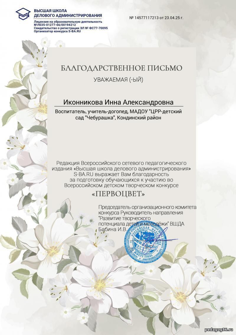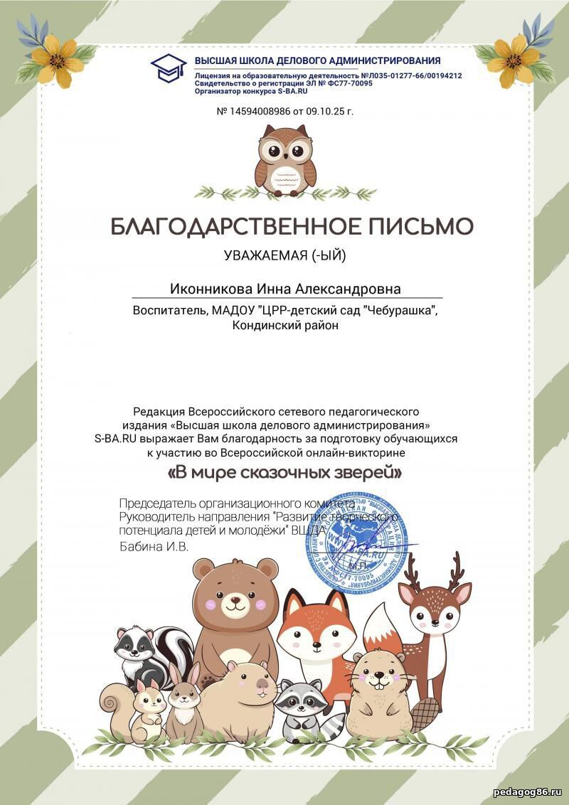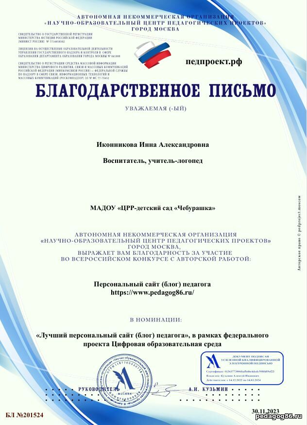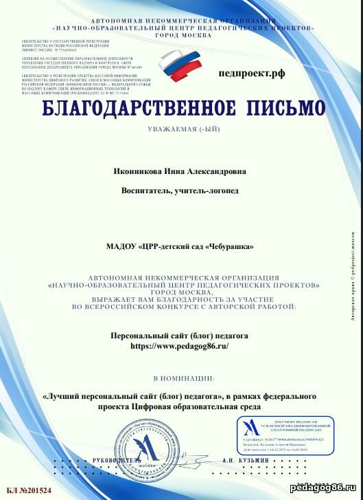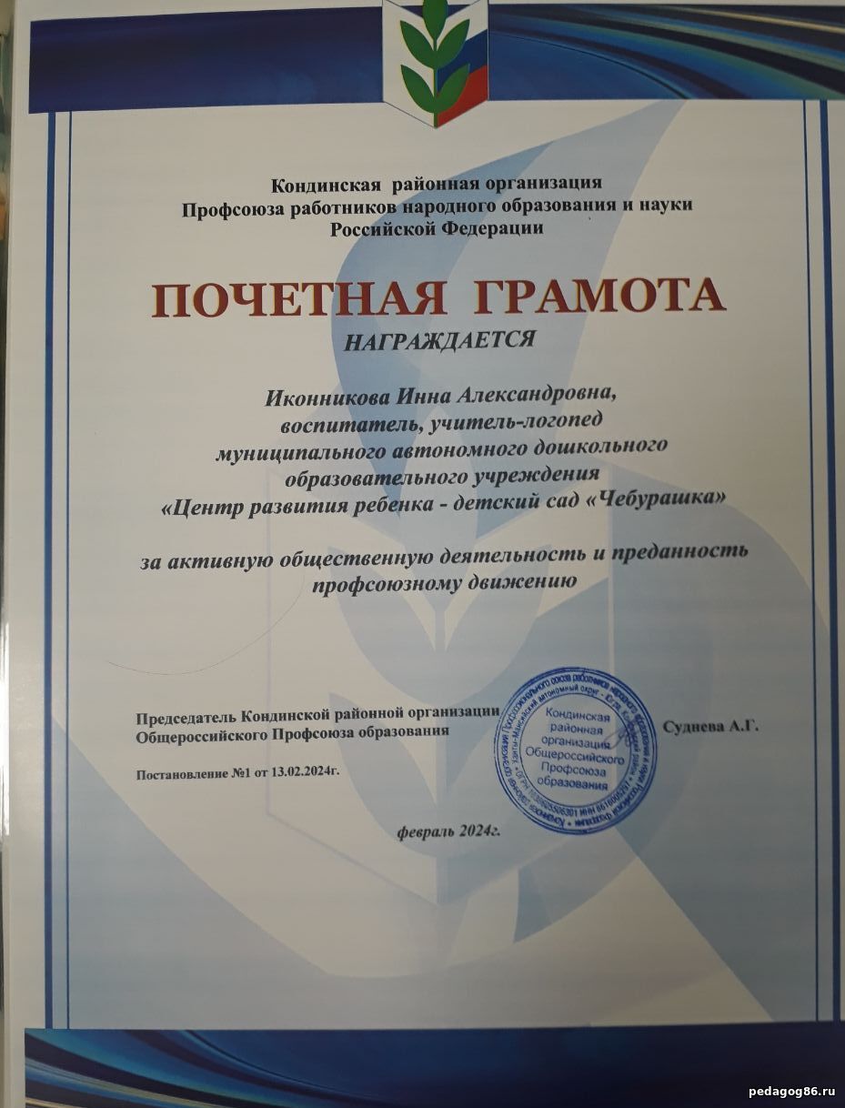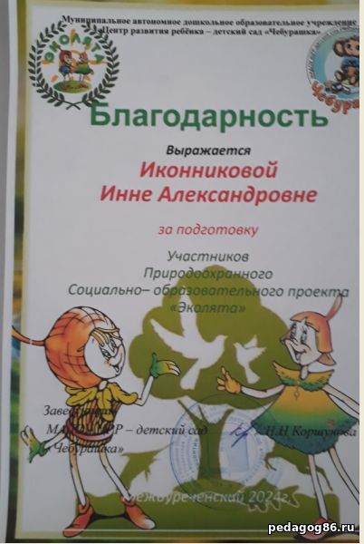 ![]() | Иконникова Инна Александровна Воспитатель, учитель - логопед МАДОУ "ЦРР- детский сад "Чебурашка" ![]() ХМАО-Югра. гп. Междуреченский | |