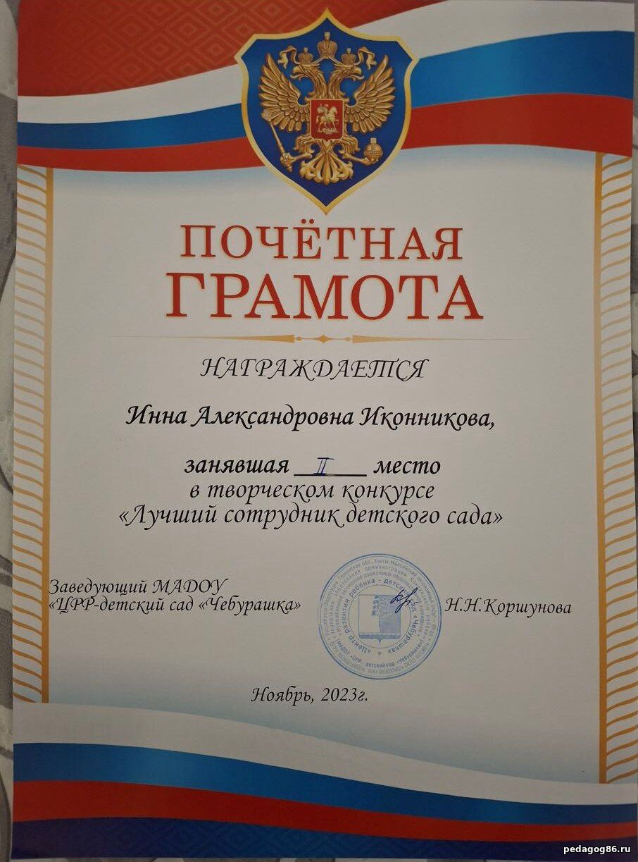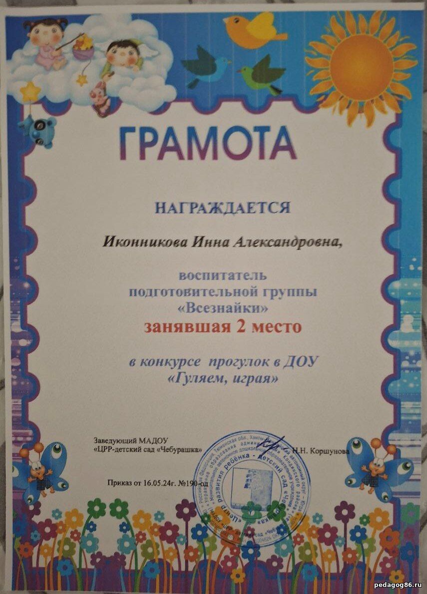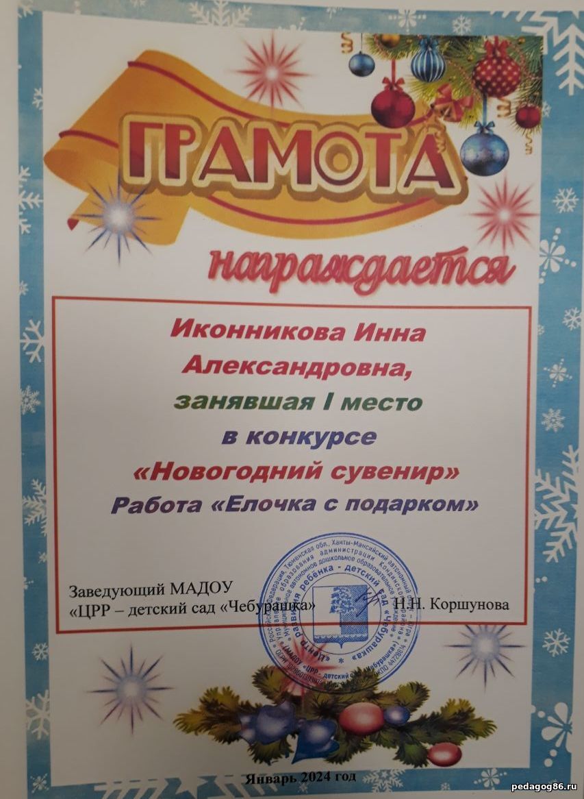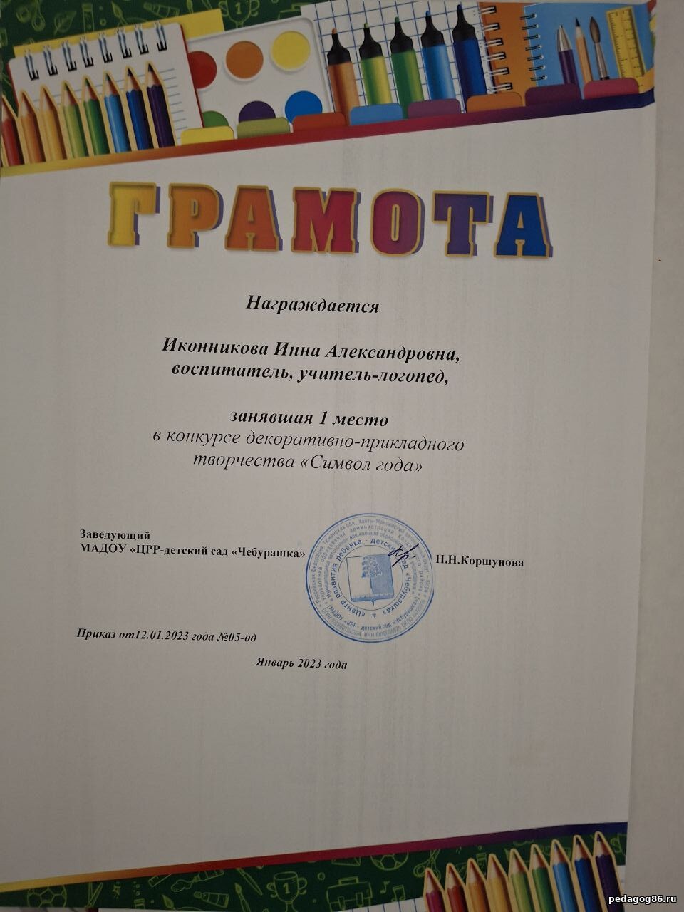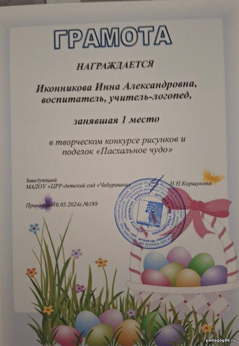![]() | Иконникова Инна Александровна Воспитатель, учитель - логопед МАДОУ "ЦРР- детский сад "Чебурашка" ![]() ХМАО-Югра. гп. Междуреченский | |