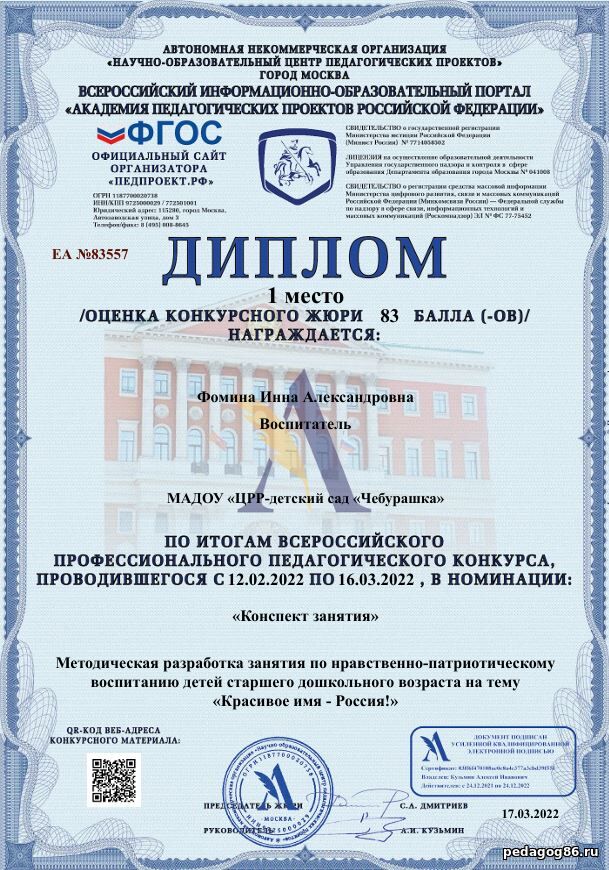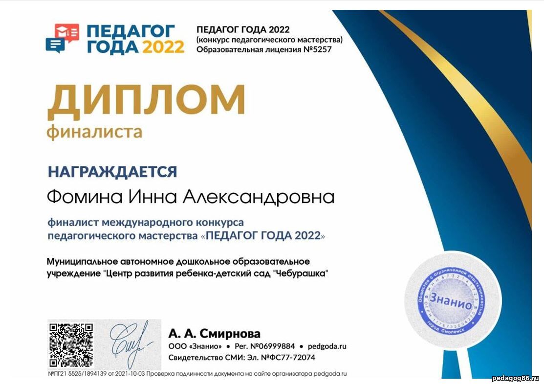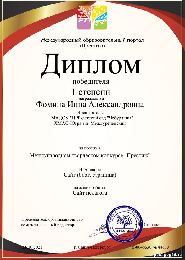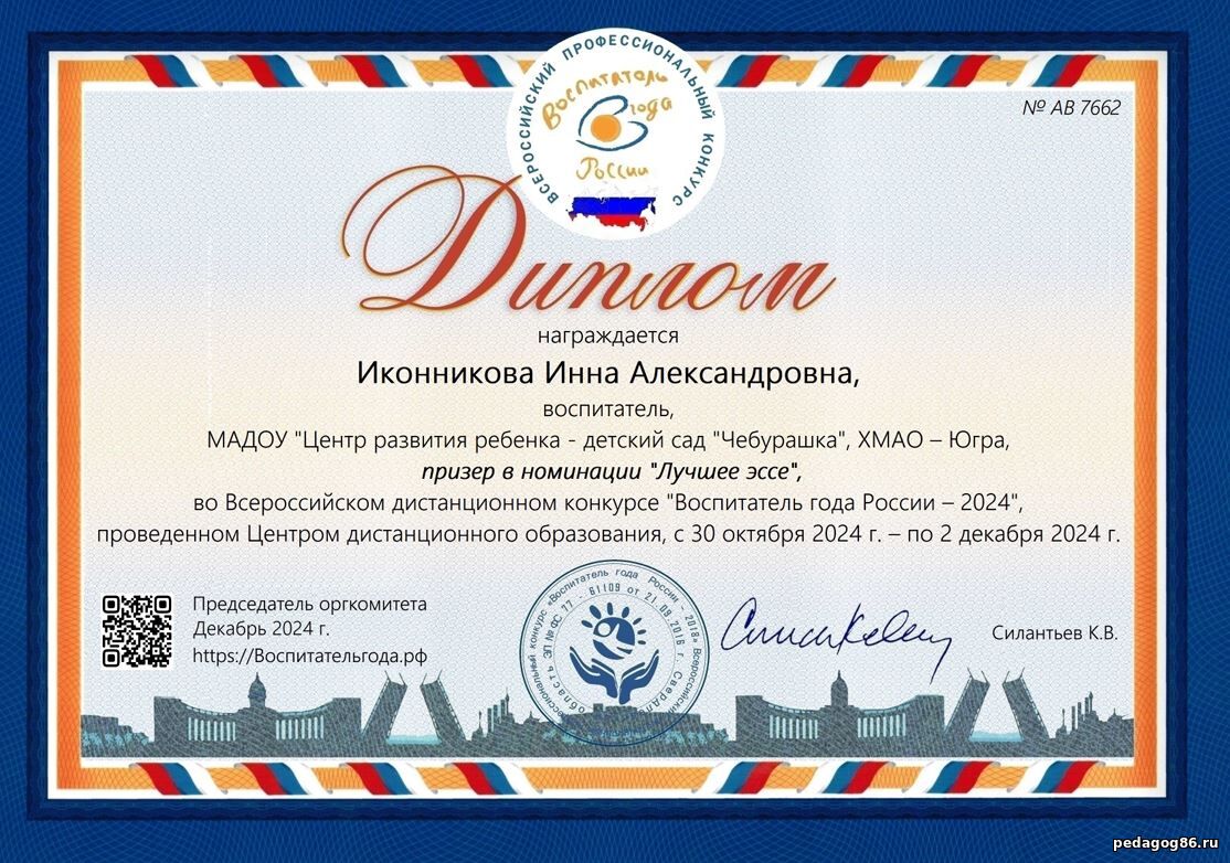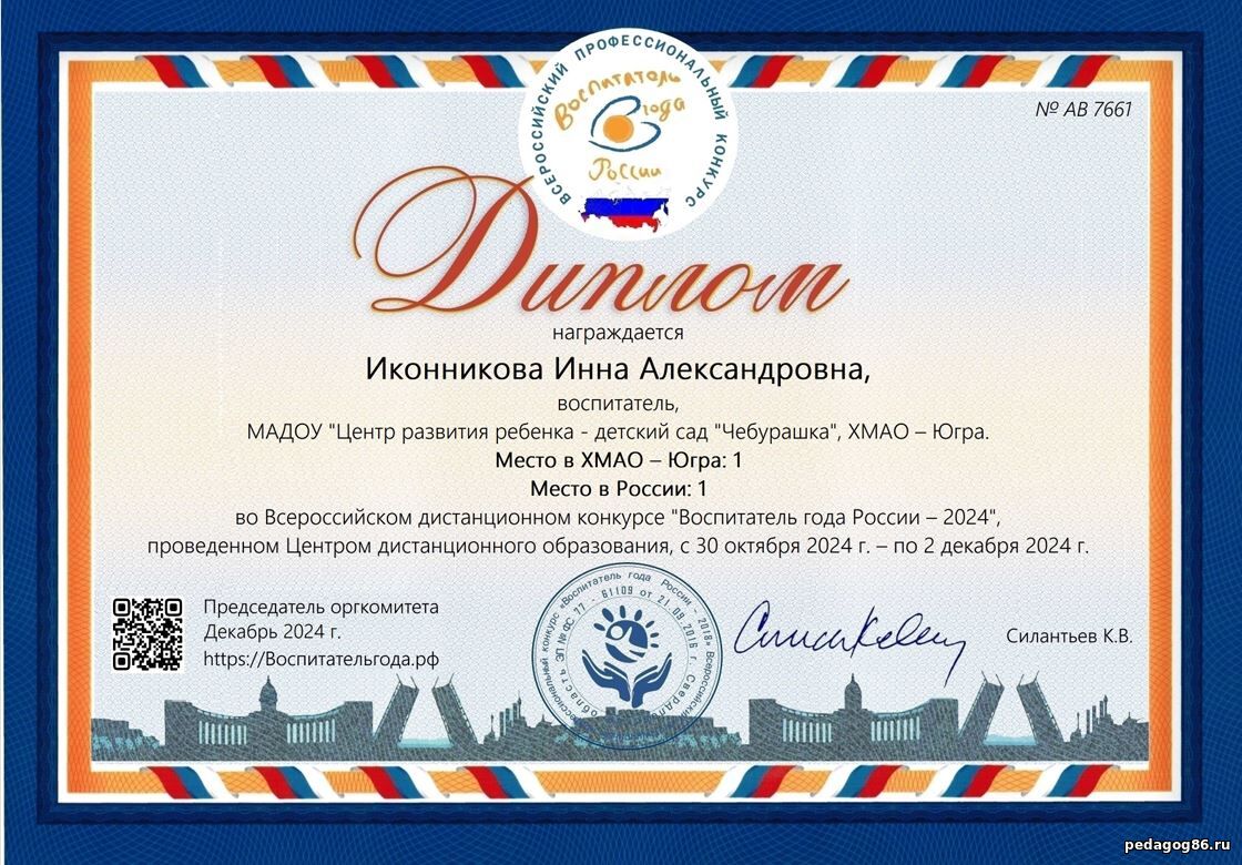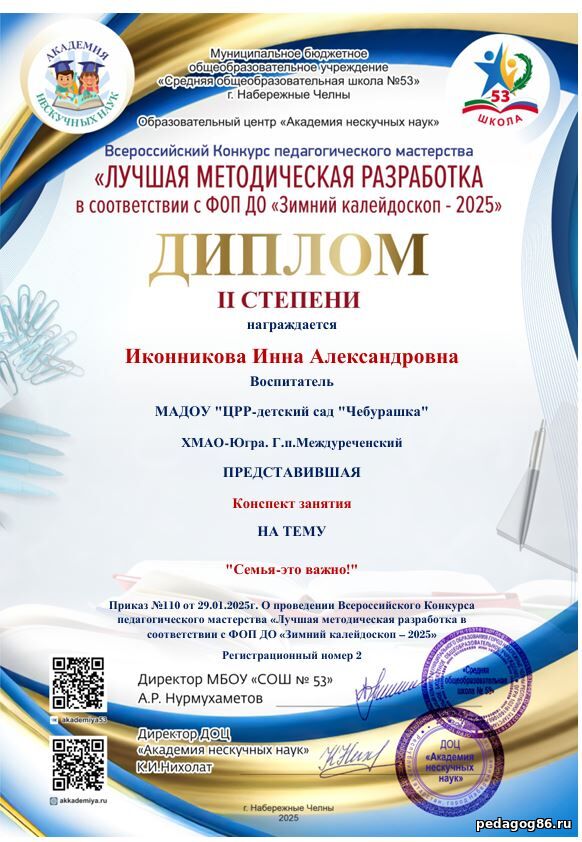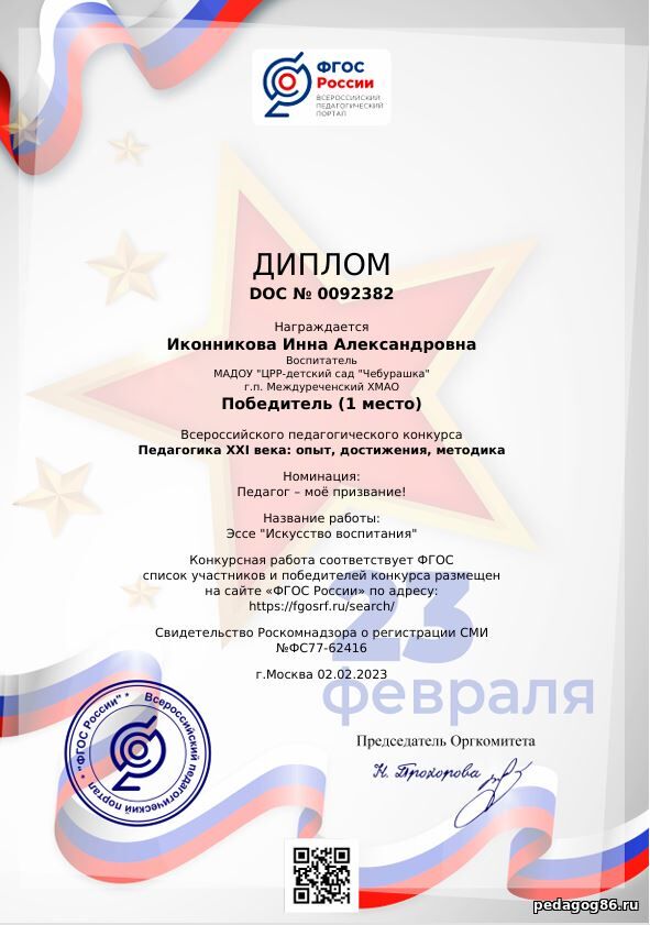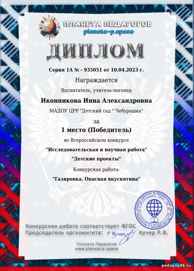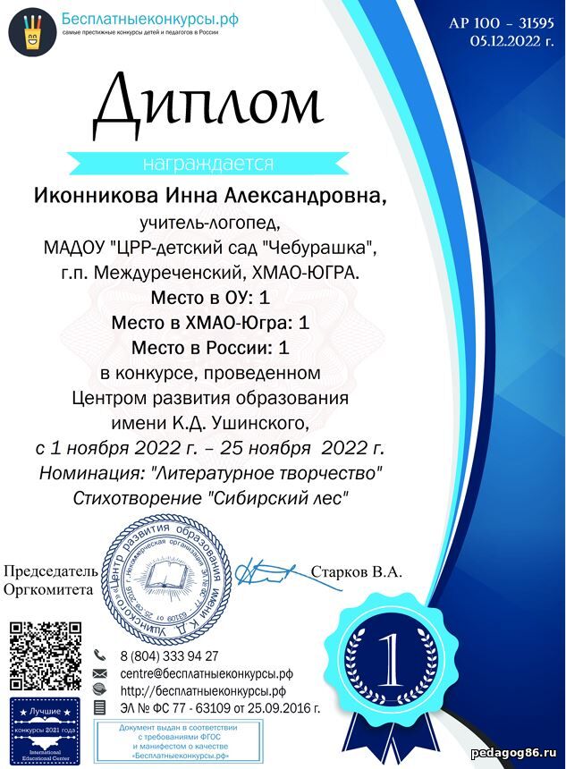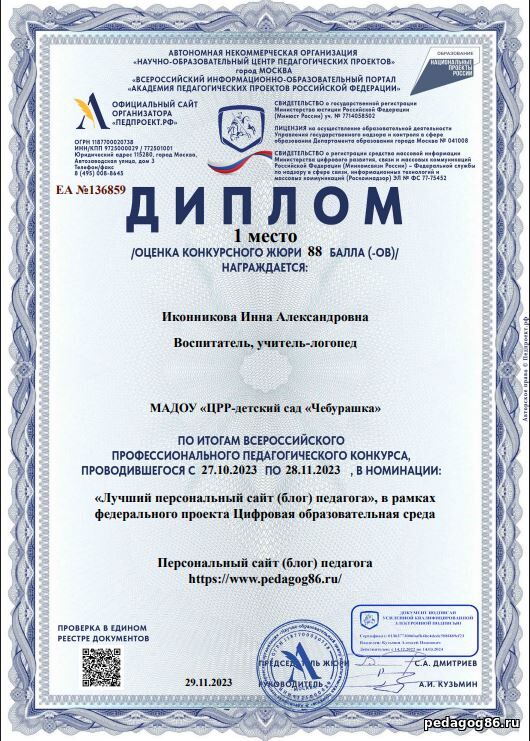 ![]() | Иконникова Инна Александровна Воспитатель, учитель - логопед МАДОУ "ЦРР- детский сад "Чебурашка" ![]() ХМАО-Югра. гп. Междуреченский | |